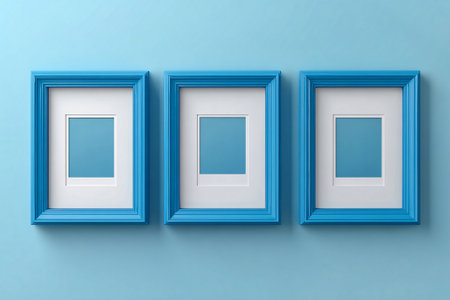 Empty blue photo frame for a collage of three photos in a minimalist style on a white background. Modern decoration.