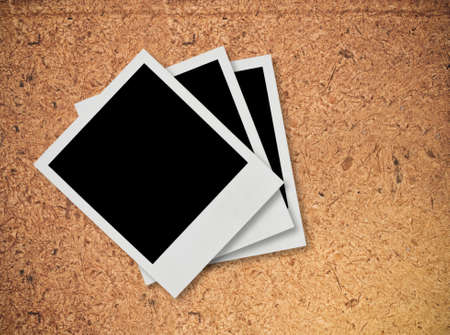 Three blank photo prints pinned to a cork notice board. Space for copy. Paths provided.