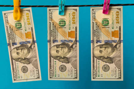 Accordion folded hundred dollar bills on a pink background. Abstract background with three banknotes.