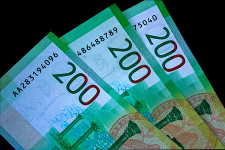 Close-up of new Russian money, banknotes worth two hundred rubles. two hundred ruble notes Russian ruble on a black background