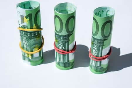 Close up of Euro money roll. Euro banknote set cash money - EU currency. Rolled with rubber euro notes. Business budget of wealth and prosperity finance. Banknotes stacked on each other in different positions.