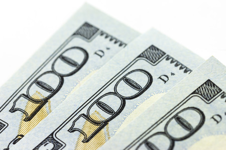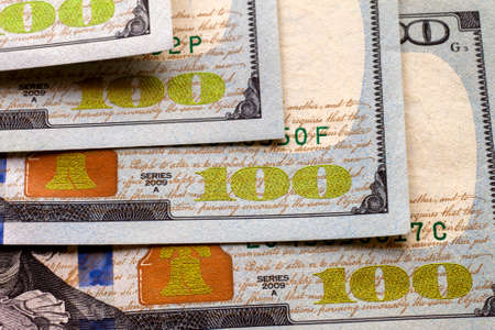 Money, prosperity and finances concept. Abstract light background of American USA national currency banknotes, details of neatly stacked bills worth one hundred dollars.