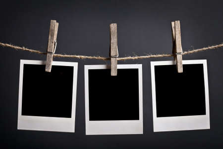 Black instant photo, hanging on the clothesline, isolated on black background.