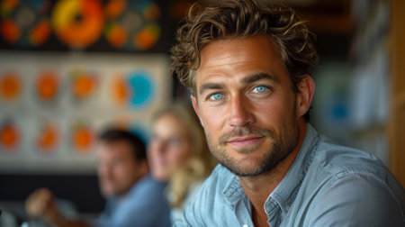 Curlyhaired man smiles at the table with group, pleased at the event
