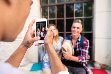 Happy friends taking selfie pic with smartphone outdoors