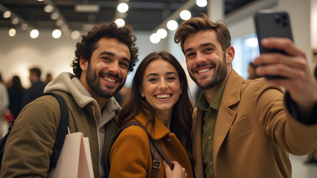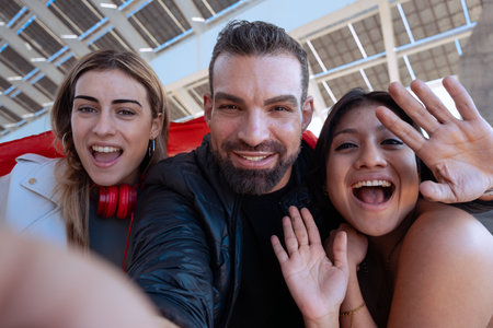Friends taking selfie on blurred street background with ample copy space for text