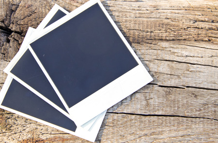 Old blank photos on the rustic wooden background