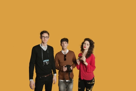 Portrait of friends standing together with cameras over colored background
