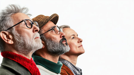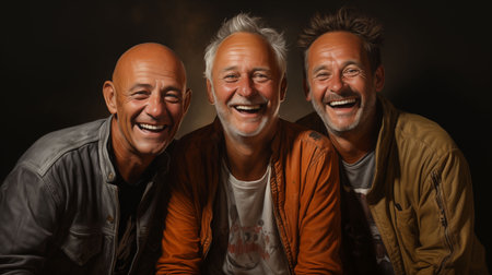 Dramatic portrait of three men of different ages and racial backgrounds, standing against a textured, vibrant color explosion. A concept of diversity and expression.