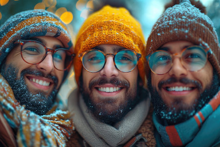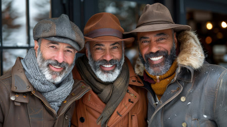 Portrait of three men with winter hats and jackets against a dark backdrop