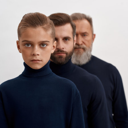 bearded man with redhead son and smiling grandson in black pullovers looking at camera isolated on grey