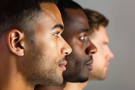 Profile view of young men of different nationalities, ethnicity and skin color, diversity