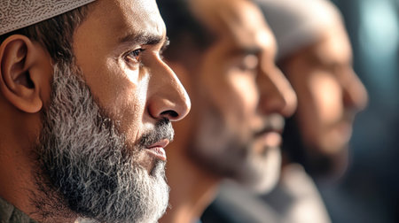 Close-up of Muslim men attentively listening to a speaker during a community gathering, showcasing their focus and connection to the discussion and each other.