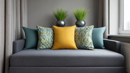 Cozy sofa adorned with vibrant patterned cushions, set against a bright window backdrop, perfect for stylish living room decor and relaxation.