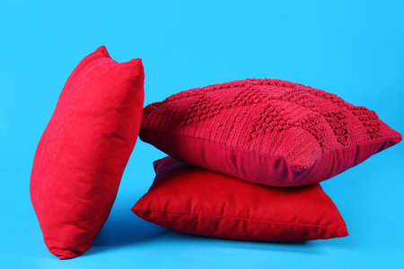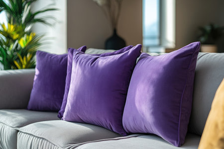 throw pillows neatly arranged on a matching couch in a colorful studio setup, creating a vibrant and cheerful interior design theme.