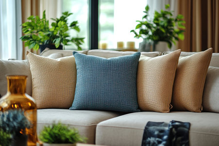 Cozy living room corner with soft pillows on a light-toned sofa and a potted plant nearby
