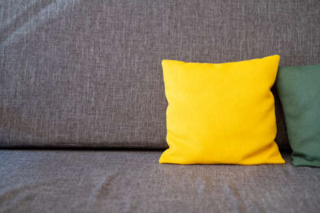 The soft textile cushion in the pastel color on the gray textile sofa in the living room of the modern house, front view with the copy space.