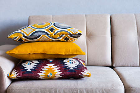 Multi-colored pillows on a beige fabric sofa, the concept of home comfort and cozy, copy space, close-up