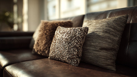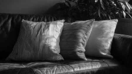 This black and white photograph captures a cozy living room featuring three decorative pillows resting on a leather sofa. The interplay of light and shadows enhances the textures and patterns of the pillows, creating a serene and inviting atmosphere perfect for relaxation.