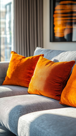 A modern living room showcases a gray sofa adorned with bright orange pillows, creating a warm and inviting atmosphere. Natural light fills the space from large windows.