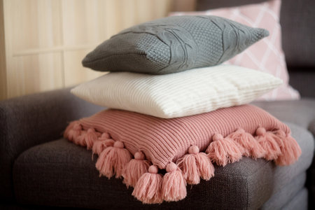 home textiles. Pillows stacked on a sofa. The concept of comfort and beauty.