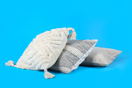 A couch with two pillows, one blue and one yellow, and a white pillow. The pillows are arranged in a way that they are not touching each other