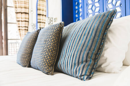 modern bedroom with set of pillows on bed, interior design concept decoration