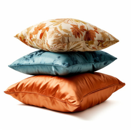 three caravaggesque-style cushions, in aquamarine and amber, are stacked on top of each other. the traditional color scheme adds a touch of elegance to these photorealistic still lifes. the flowing fabrics and floral accents create a visually captivating scene. the matte photo finish enhances the overall aesthetic appeal. ai generated