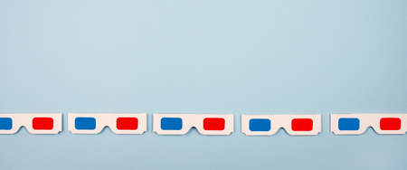 Banner with classic paper 3D glasses in a row on blue background. Copy space.