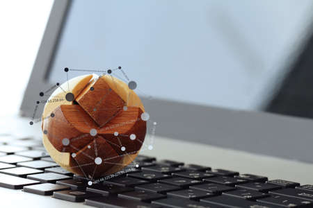 The laptop screen on the table is open. Key word on wooden cubes on laptop. Photographs were taken in the spotlight.