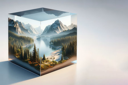 Six cubes showcasing different biomes including desert, forest, mountains, water, tundra, and a river landscape