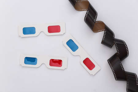 Film tape and 3d glasses on white background. Cinema, Entertainment industry. top view