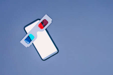 3D glasses with smartphone mockup with white screen on gray background. Glasses for watching videos in 3D