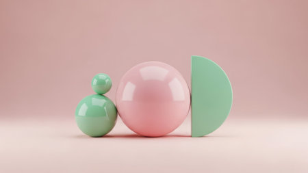 A still life composition of colorful 3D geometric shapes with smooth gradients, placed on a soft, light background.
