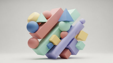 An abstract 3D composition featuring a playful stack of various colorful geometric shapes in pastel tones.