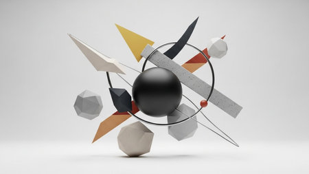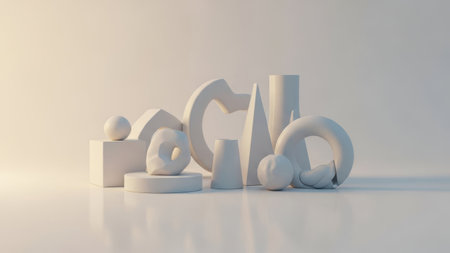 Asymmetrical arrangement of muted tone geometric shapes like cubes, spheres, and rings floating in a clean...