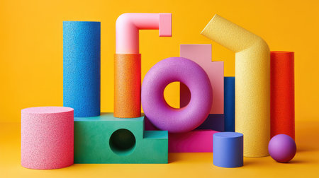 This image showcases a vibrant arrangement of abstract geometric shapes, featuring varied textures and playful colors that evoke creativity.