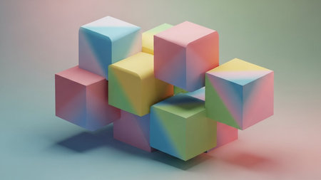 Soft pastel colored geometric cubes floating in a gentle arrangement against a gradient background.