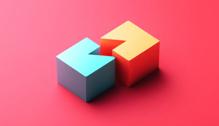 Isometric, colorful logo of two simple cubes connected by an arrow, on a red background, 3D render, minimalistic design, vector graphics, simple shapes, clean and sharp edges, professional color palette, vibrant colors, high resolution, high quality. --ar 26:15 --v 6.1 Job ID: b36b9f71-1ee3-43fb-b439-91d8ecfa2666