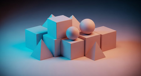 A minimalist composition of various geometric shapes including cubes, spheres, and pyramids. The are arranged in a visually appealing cluster on a flat surface. Soft pastel lighting in shades of teal and orange creates a gentle gradient across the scene, casting subtle shadows and highlighting the smooth, matte surfaces of the shapes. The overall aesthetic is clean, modern, and abstract, emphasizing form and light.