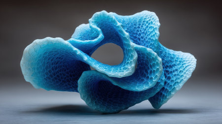 A blue sculpture of a sea creature with a hole in the middle. The sculpture is made of a blue material and is placed on a gray surface
