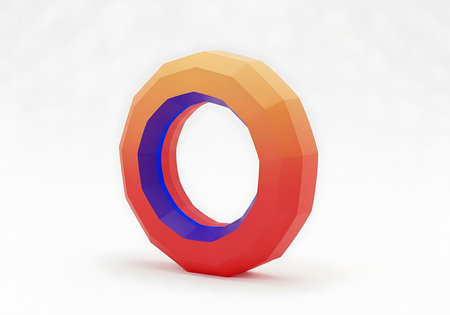 A low polygon, three-dimensional model of a circular object featuring vibrant orange and deep blue colors, presented against a clean, bright white backdrop for clear visual focus and detail examinatio