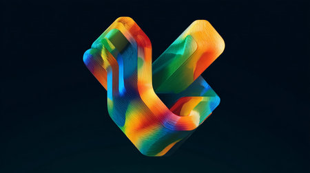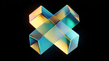 An abstract, three-dimensional geometric shape, constructed with interconnected cubes, rests against a dark backdrop. The object displays a range of colors, including blues, yellows, and greens, suggesting reflections and refractions. The image utilizes precise lighting, potentially suitable for digital design, advertisements, or visual marketing materials.