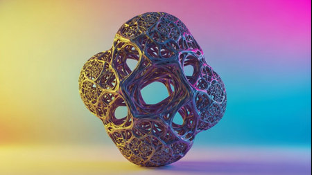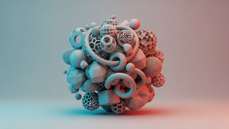 Organic showing abstract 3d rendered sculpture with interlocking smooth torus shapes and geometric polyhedra in gradient colors keywords: abstract, 3d, render,...