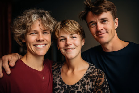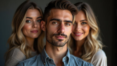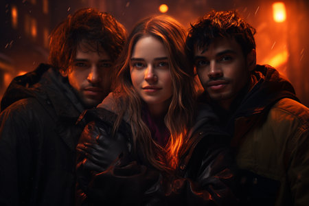 Three individuals share a captivating moment under soft lighting, showing a blend of natural beauty and elegance with an intense gaze. Perfect for creative projects. Generated A.I.