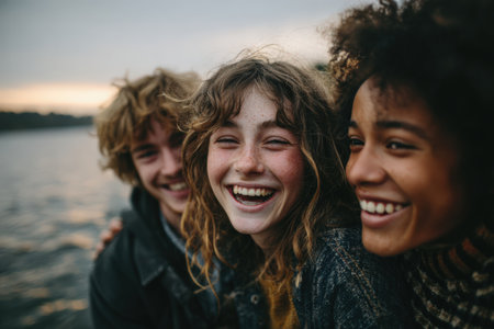 Diverse group of young friends enjoying time by the water, sharing laughter and smiles, embodying the spirit of friendship and connection in a serene outdoor environment