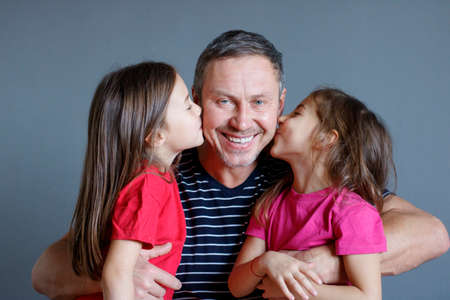 Friendly relations. Girl and guys happy together. Woman hugs two men. More than friends. True friendship and human relations. Group friends hug blue background. We are family. Free relations