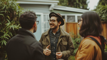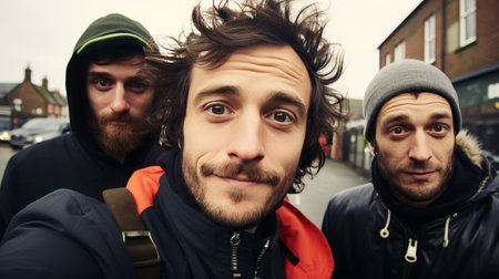 Three happy young friends are smiling and enjoying each other's company outdoors in winter