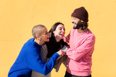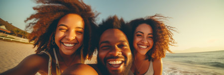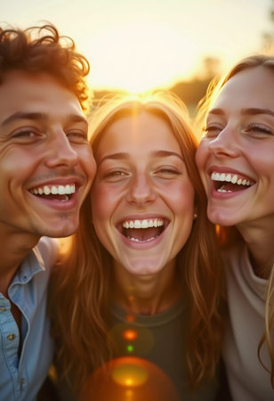 Three friends are basking in warm sunlight, sharing genuine laughter and smiles as they create unforgettable memories on their journey together. Their joyous spirits radiate happiness.