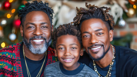 Joyful African American family poses together in a warm holiday atmosphere, surrounded by colorful decorations and lights.